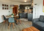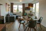 Der großzügige, hell und modern eingerichtete Wohnbereich bietet eine zusätzliche Schlafgelegenheit für 2 Pers. , einen Essbereich, Küchenzeile und führt auf den Balkon.